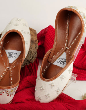 This elegant off-white Khussa features delicate silver thread embroidery scattered gracefully