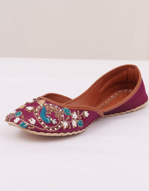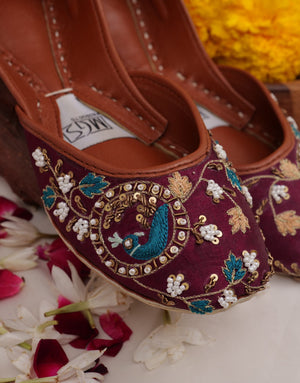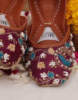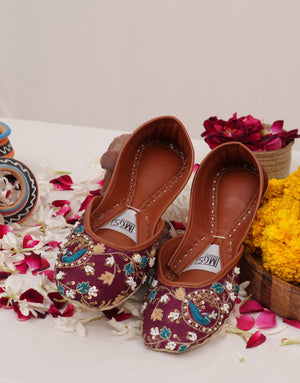 An exquisite, handcrafted khussa that embodies the essence of artisanal craftsmanship, his stunning pair features an intricate, hand-embroidered design in mustard and purple testament to the skill and dedication of our artisans. With its unique blend of colors and classic design, is perfect for making a statement on Eid and beyond.