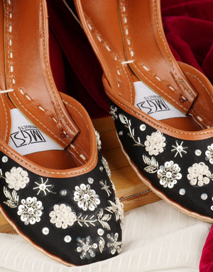 A classic black base transformed with heavy silver floral and vine embroidery, sequins, and beadwork. This Khussa is a statement piece, ideal for night events, parties, or adding dramatic contrast to light-colored outfits.