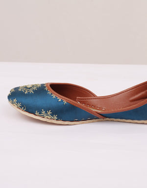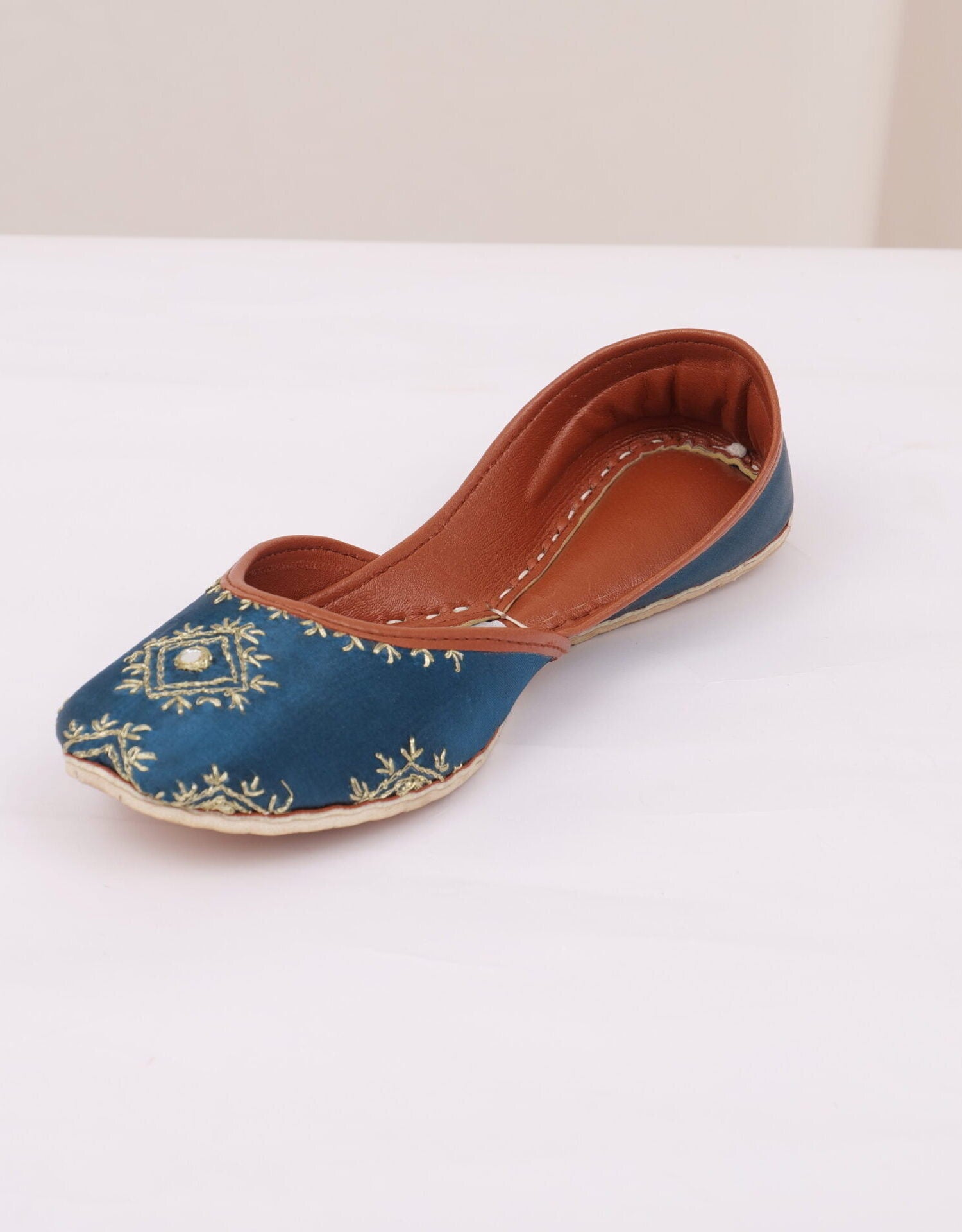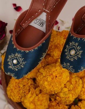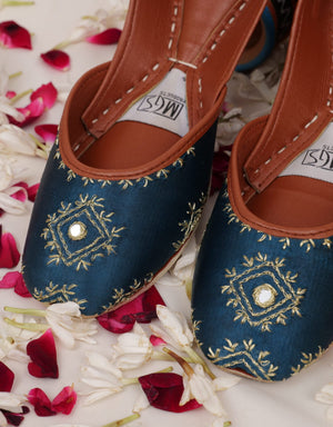 Crafted with love, this stunning peacock green khussa features intricate golden zari and mirror work, showcasing the skill and dedication of our master artisans.