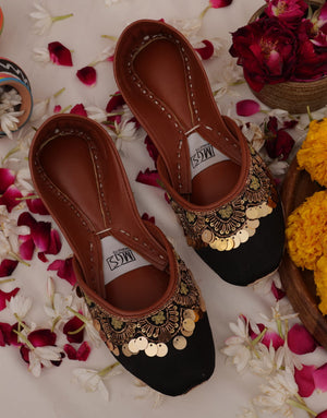 A statement black khussa adorned with elegant antique gold embroidery and shimmering sequins, finished with playful gold discs that catch the light with every step. Paired beautifully with traditional or fusion wear, these khussas promise to elevate your look effortlessly.