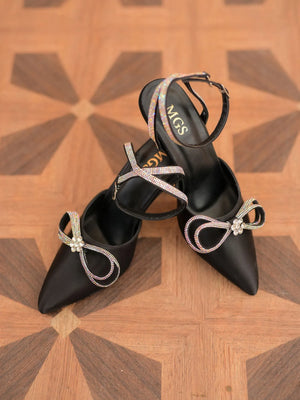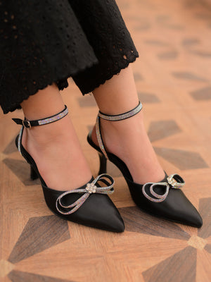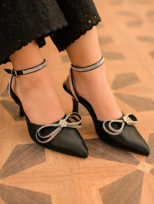 Turn heads with Midnight Luxe — a stunning blend of sophistication and sparkle. Crafted in classic black with elegant pointed toes, adorned with dazzling crystal bows and matching anklet straps that catch the light with every step. Perfect for evening soirées, weddings, or whenever you want to add a glamorous finish to your outfit.