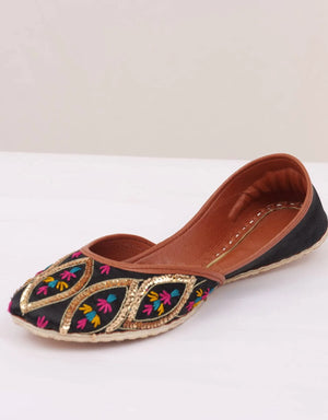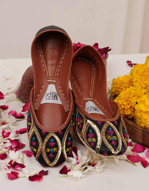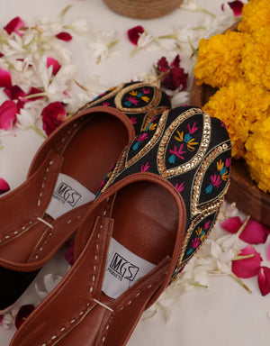 A mesmerizing black base brought to life with intricate hand-embroidered florals in hot pink, orange, and green threads. Embellished with delicate golden sequins and patterned motifs, these khussas are perfect for adding a pop of color and charm to your festive outfits. Ideal for Eid, weddings, and all your special occasions.