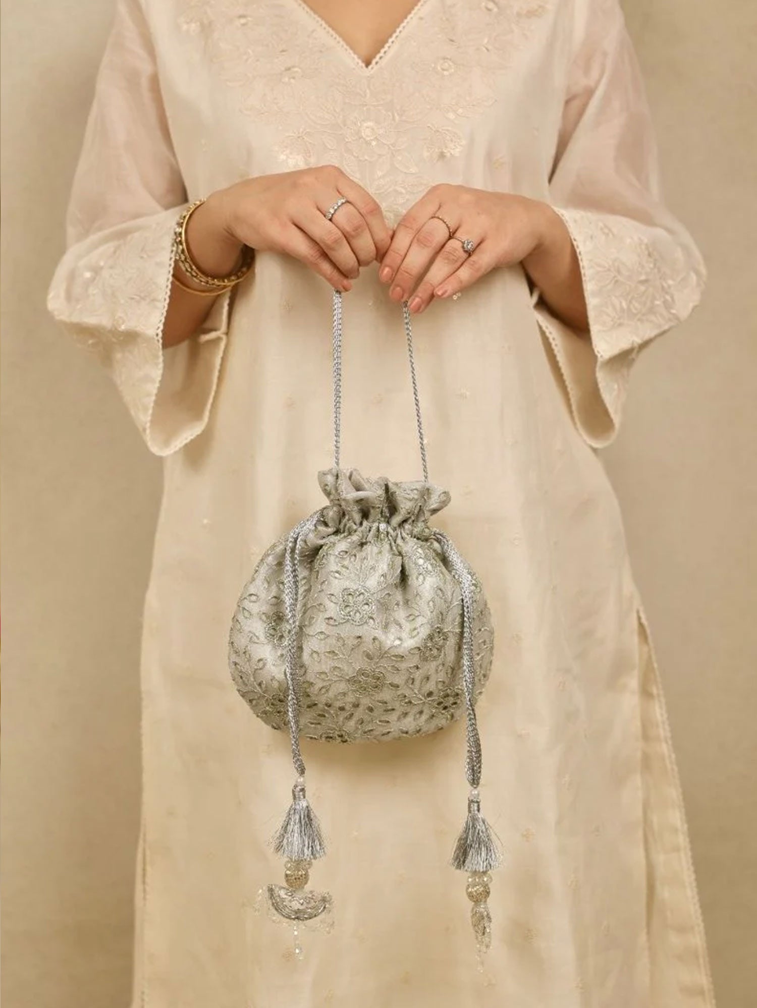 Elegant and effortlessly graceful, the Sahar Potli is crafted in a soft fabric with fine floral embroidery that adds a subtle shimmer to your festive or bridal ensemble. Its delicate threadwork is paired with silver braided drawstrings and handmade pearl-tassel accents, offering a timeless traditional charm. Perfect for formal occasions, weddings, and festive events, this potli blends sophistication with functionality — a must-have for anyone who appreciates handcrafted detail and classic design.