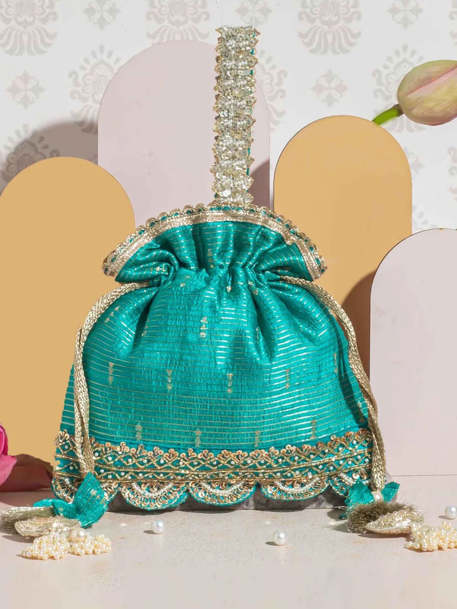 Elevate your festive look with the TOOR Turquoise Striped Zari Potli, a beautifully handcrafted piece made from premium turquoise striped fabric with woven gold detailing. This potli features an elegant lower border embellished with fine zari, sequins, pearls, and thread embroidery, giving it a rich and festive feel. The potli is finished with golden braided drawstrings and handcrafted tassels featuring pearls and silk threads, making it an ideal accessory for weddings, mehndi functions, or festive gifting.