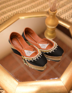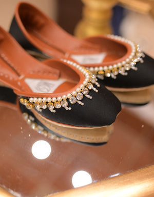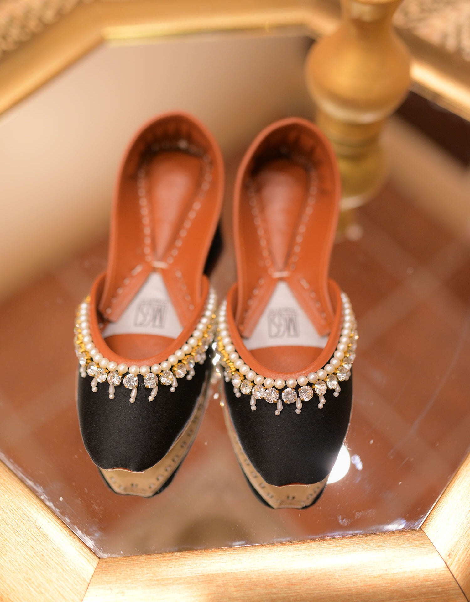 The Zarina Noir is all about royal elegance. Crafted on a smooth black satin base, this